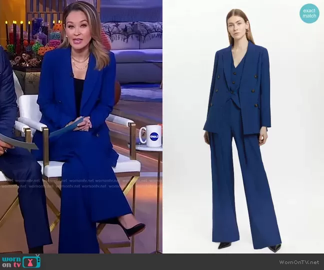 Eva Pilgrim on Good Morning America on ABC was spotted wearing this blue blazer and pants on Good Morning America on May 15 2025's episode. Eva's Jacket is the Polished Stretch Wool Blend Double Breasted Blazer by Karen Millen . Eva's Pants is the Polished Stretch Wool Blend Pleated Wide Leg Pants by Karen Millen.