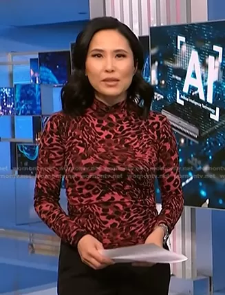 Vicky Nguyen on NBC News Daily on NBC was spotted wearing this pink leopard turtleneck top on NBC News Daily on Oct 31 2023's episode. Vicky's Top is the Eedar Kiara T-Shirt by Allsaints.