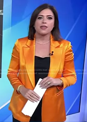 on NBC News Daily on NBC was spotted wearing this orange satin blazer on NBC News Daily on Oct 31 2023's episode. 's Jacket is the Denny Blazer by Alice + Olivia.