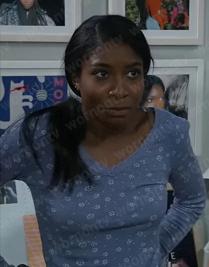 At General Hospital, the bonds of friendship often extend into shared wardrobes. Trina, adorning herself in a delicate cornflower blue pajama top, subtly nods to a piece once worn by her dorm roommate and best friend, Josslyn. The lace-trimmed floral rib-knit top by Hippie Rose is sprinkled with tiny white flowers, creating a serene bedtime look. As the two share laughs, stories, and now even fashion choices in their shared space, this top has become an emblem of their deepening connection.