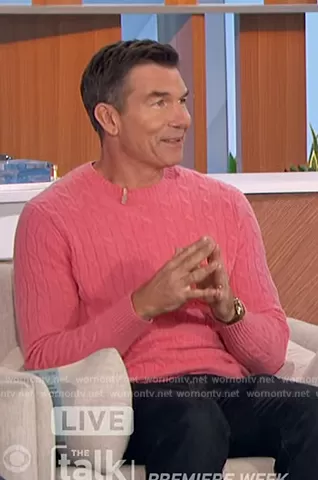 Jerry O'Connell on The Talk on CBS was spotted wearing this pink cable knit sweater on The Talk on Oct 26 2023's episode. Jerry's Sweater is the Cable Crew Neck Sweater by Brooks Brothers.