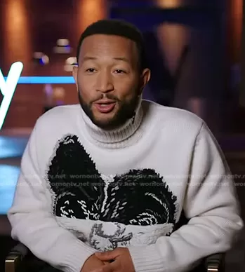 John Legend on The Voice on NBC was spotted wearing this white and black embroidered turtleneck sweater on The Voice on Oct 18 2023's episode. John's Sweater is the Orchid Wool-Cashmere Turtleneck Sweater by Alexander McQueen.