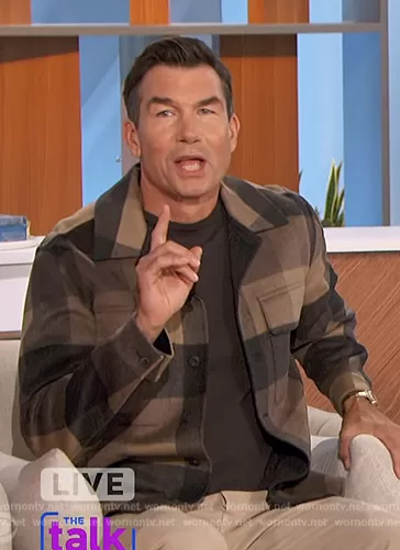 Jerry O'Connell on The Talk on CBS was spotted wearing this brown check jacket on The Talk on Oct 29 2023's episode. Jerry's Jacket is the Splittable Shirt Jacket by Vince.