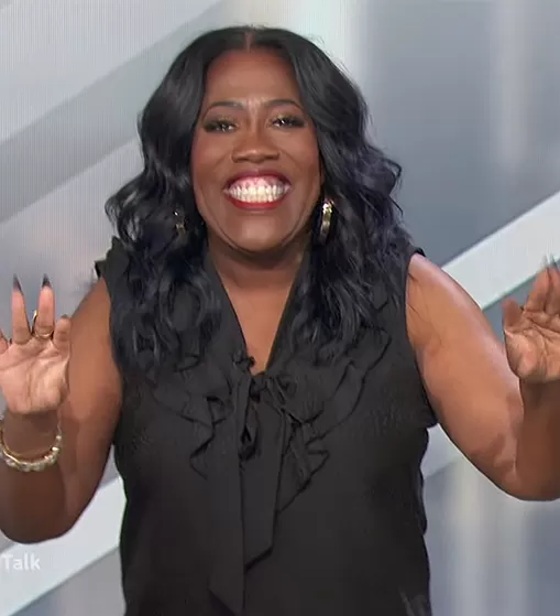 Sheryl Underwood on The Talk on CBS was spotted wearing this black sleeveless ruffle top on The Talk on Nov 01 2023's episode.