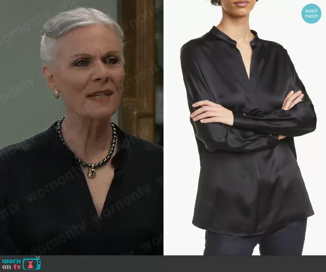 Elegance and luxury intertwine as Tracy showcases the band collar silk blouse in black by Vince on General Hospital. While she has sported this top in various hues, the classic black stands out, accentuating her grace and sophisticated style. The flattering v-neck design may appear simple, but it carries an undeniable aura of opulence. Made from 100% silk, this blouse isn't just a fashion choice for Tracy; it's a testament to her impeccable taste, proving that sometimes, simplicity paired with premium quality creates the most memorable statements.