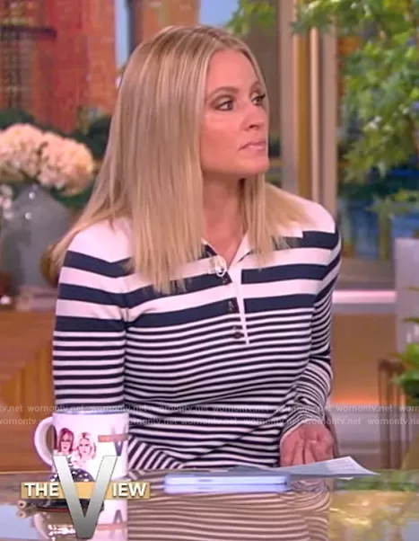 Sara Haines on The View on ABC was spotted wearing this white stripe long sleeve polo on The View on Nov 02 2023's episode. Sara's Top is the Raj Striped Wool Polo by Veronica Beard . Sara's Pants is the Averie Wide-Leg Button Pants by Ramy Brook.