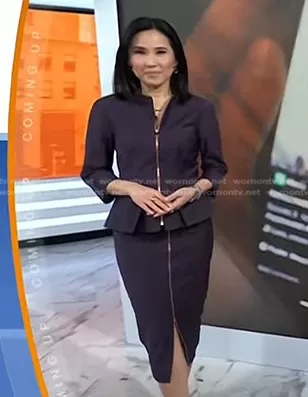 Vicky Nguyen on Today on NBC was spotted wearing this purple peplum jacket and skirt on Today on Nov 02 2023's episode. Vicky's Jacket is the Eben Peplum Suit Jacket in Grape by Ted Baker . Vicky's Skirt is the Eben Pencil Skirt in Grape by Ted Baker.