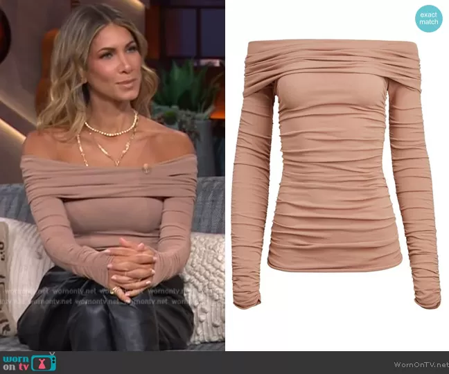 on The Kelly Clarkson Show on NBC was spotted wearing this mesh off shoulder top on The Kelly Clarkson Show on Nov 02 2023's episode. 's Top is the Elsa Top by Khaite.