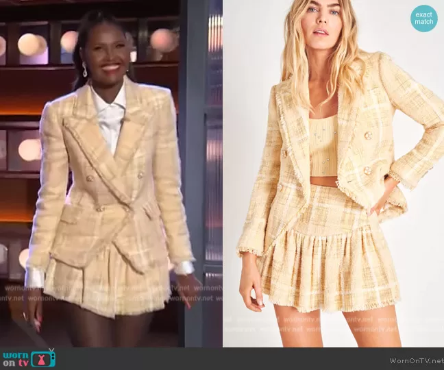 on The Kelly Clarkson Show on NBC was spotted wearing this yellow tweed jacket and skirt on The Kelly Clarkson Show on Nov 02 2023's episode. 's Jacket is the Denison Blazer by Loveshackfancy . 's Skirt is the Lively Tweed Mini Skirt by Loveshackfancy.