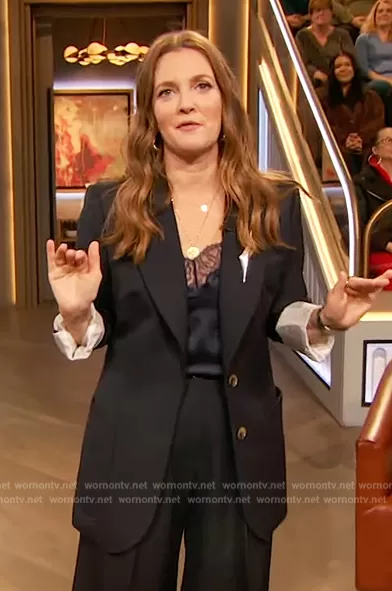 Drew Barrymore on The Drew Barrymore Show on CBS was spotted wearing this lace trim cami and suit on The Drew Barrymore Show on Nov 03 2023's episode. Drew's Top is the Seraphina lace-trimmed silk-satin camisole by Cami NYC . Drew's Blazer is the Cavalry Twill Saint James Jacket by Bella Freud . Drew's Pants is the Cavalry Twill David Trousers by Bella Freud.