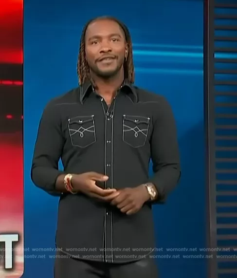 Scott Evans on Access Hollywood on NBC was spotted wearing this denim western shirt on Access Hollywood on Nov 02 2023's episode. Scott's Shirt is the Black Denim 70s Western Shirt by Phix.