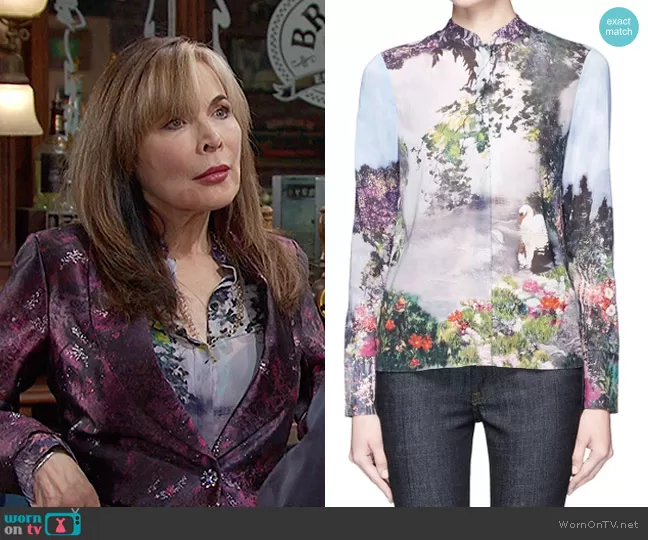 Kate Roberts (played by Lauren Koslow) on Days of our Lives on Peacock was spotted wearing this blue floral shirt and purple print blazer on Days of our Lives on Nov 03 2023's episode. Kate's Top is the Vina Printed Blouse by Alice + Olivia . Kate's Jacket is the Printed Single-Breasted Longer-Length Blazer by Scotch & Soda.