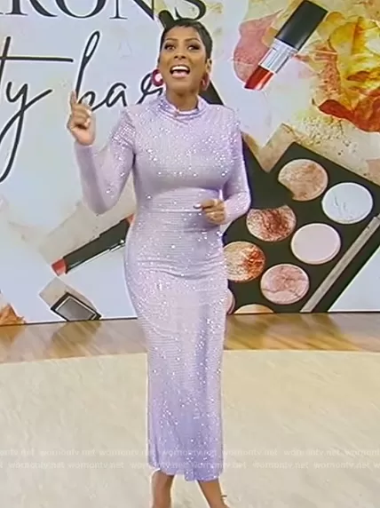 Tamron Hall on Tamron Hall Show on ABC was spotted wearing this lavender rhinestone embellished long sleeve dress on Tamron Hall Show on Nov 03 2023's episode. Tamron's Dress is the Rhinestone Contour-Print Mock-Neck Midi Dress by Self Portrait.