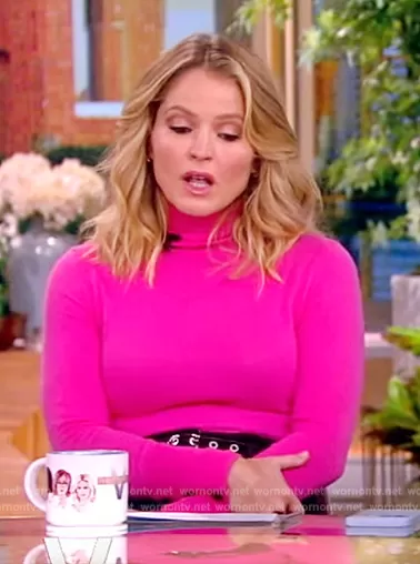 Sara Haines on The View on ABC was spotted wearing this pink turtleneck sweater on The View on Nov 02 2023's episode. Sara's Sweater is the Flora Sweater by L'Agence.