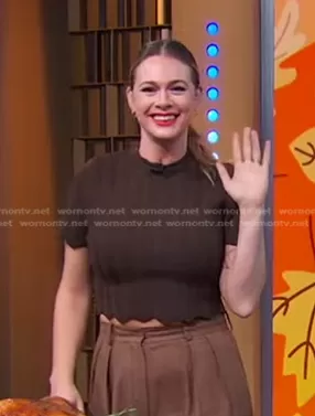 on Good Morning America on ABC was spotted wearing this brown scalloped top on Good Morning America on Nov 03 2023's episode. 's Top is the Poppy Scalloped Rib-Knitted Cropped Top by Clea.