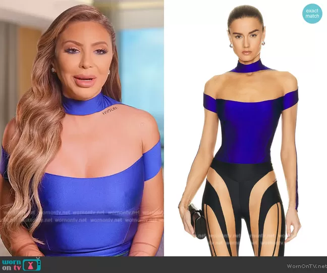 Larsa Pippen (played by Larsa Pippen) on The Real Housewives of Miami on Peacock was spotted wearing this blue confessional top on The Real Housewives of Miami on episode 'Nuevos Horizontes' (6x01) in Nov 2023. Larsa's Bodysuit is the Long Sleeve Bodysuit by Mugler.