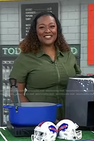 on Today on NBC was spotted wearing this green zip front jumpsuit on Today on Nov 03 2023's episode. 's Jumpsuit is the The Colette Weekend Jumpsuit in Holly by Maeve.