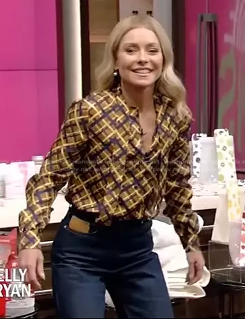 Kelly Ripa on Live with Kelly and Mark on Disney ABC Home Entertainment was spotted wearing this plaid tie neck blouse on Live with Kelly and Mark on Jun 25 2024's episode. Kelly's Top is the Retro Diamond-Printed Silk Blouse by Saint Laurent.