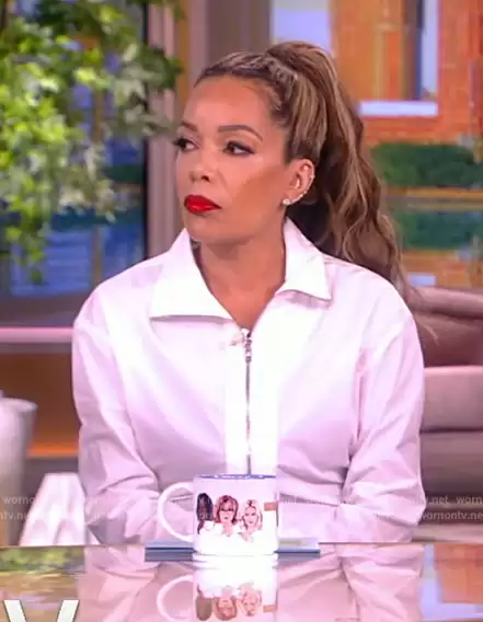 Sunny Hostin on The View on ABC was spotted wearing this white zip front dress on The View on Jul 22 2024's episode. Sunny's Dress is the Poplin Gathered Zip-Front Midi Dress by Alaia.