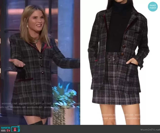 on The Kelly Clarkson Show on NBC was spotted wearing this black plaid jacket and skirt on The Kelly Clarkson Show on Nov 06 2023's episode. 's Jacket is the Ross Blazer by Cara Cara . 's Skirt is the Kaya Skirt In Plaid Charcoal by Cara Cara.
