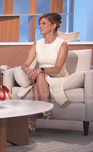 Natalie's look on The Talk was the embodiment of modern sophistication, featuring a stunning textured asymmetric dress by Alexander McQueen that was both understated and impactful. The sleeveless ivory dress showcased a subtle geometric pattern within its fabric, playing with texture and form while maintaining a monochromatic palette. Its asymmetric hem added a contemporary twist to the silhouette, enhancing Natalie's poise as she engaged in the day's topics. Completing the ensemble, her feet were adorned with the iconic Valentino Garavani Rockstud Ankle Strap Pumps, the tonal studs adding a touch of edgy luxury. Though the McQueen dress might be sold out, the timeless Rockstud pumps serve as a reminder that some pieces remain eternal staples in the fashion-conscious landscape.