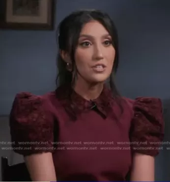 on Good Morning America on ABC was spotted wearing this red lace puff sleeve dress on Good Morning America on Nov 06 2023's episode. 's Dress is the Williams Lace Puff Sleeve Minidress in Fig by Likely.