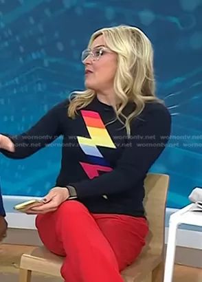 on Today on NBC was spotted wearing this rainbow lightning bolt sweater on Today on Nov 07 2023's episode. 's Sweater is the Rain-Bolt Pullover by 525 America.