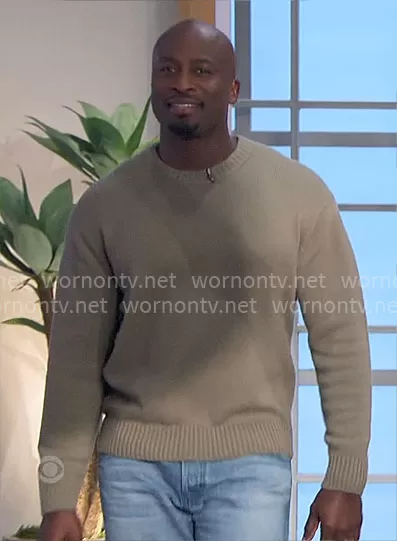 Akbar Gbajabiamila on The Talk on CBS was spotted wearing this khaki green sweater on The Talk on Nov 07 2023's episode. Akbar's Sweater is the Cashmere Crewneck Sweater in Khaki Green by Frame . Akbar's Shoes is the Air Force 1 Sneaker by Nike.