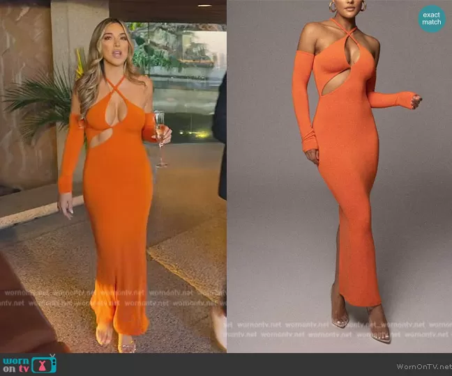 Alex Hall on Selling Sunset on Netflix was spotted wearing this orange strappy cutout dress on Selling Sunset on episode 'House of Horrors' (7x03) in Nov 2023. 's Dress is the Orange Soledad Cross Maxi Dress by JLux Label.