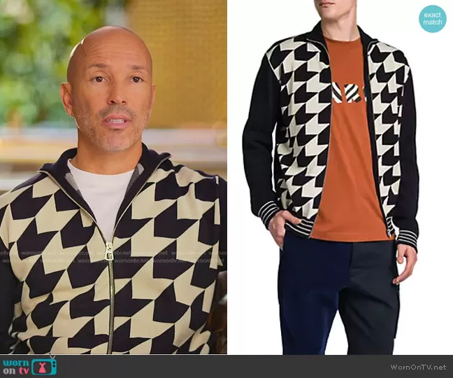 Brett Oppenheim on Selling Sunset on Netflix was spotted wearing this navy and white print zip jacket on Selling Sunset on episode 'The Girls are Back in Town' (8x01) in Nov 2025. Brett's Jacket is the Pied De Poule Jacquard Zip Cardigan by Marni.