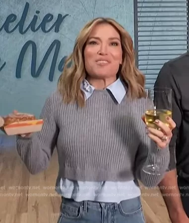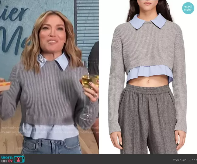 Kit Hoover on Access Hollywood on NBC was spotted wearing this gray layered sweater on Access Hollywood on Nov 08 2023's episode. Kit's Sweater is the Radieux Cropped Sweater by Sandro . Kit's Pants is the Taylor Cropped High Rise Wide-Leg Jeans by Veronica Beard.