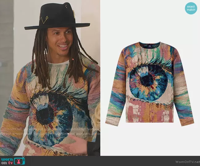 Garran on Selling Sunset on Netflix was spotted wearing this multicolored eye graphic sweater on Selling Sunset on episode 'Setting The Stage for Disaster' (7x05) in Nov 2023. 's Sweater is the Visualeyes Sweater by Dream of Threads.