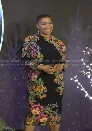 Deja Vu on Live with Kelly and Mark on Disney ABC Home Entertainment was spotted wearing this black floral print dress on Live with Kelly and Mark on Dec 08 2025's episode. Deja Vu's Dress is the Mock-Turtleneck Floral Sheath Dress by London Times.