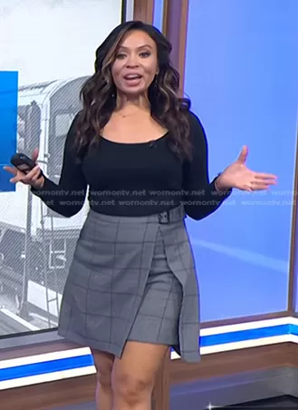 Adelle Caballero on Today on NBC was spotted wearing this grey plaid belted skirt on Today on Nov 09 2023's episode. Adelle's Skirt is the Kearuh Skirt by Club Monaco.