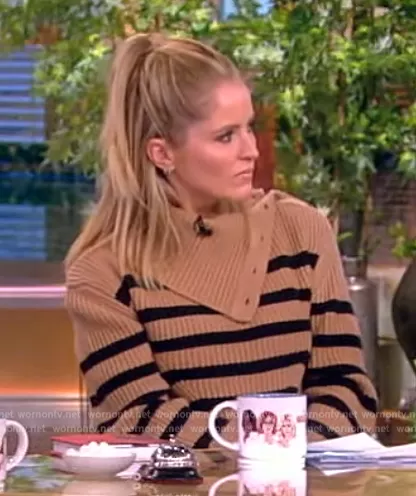 Sara Haines on The View on ABC was spotted wearing this brown striped turtleneck sweater on The View on Nov 09 2023's episode. Sara's Sweater is the Adrienne Sweater by Simkhai.