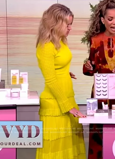 Sara Haines on The View on ABC was spotted wearing this yellow pointelle dress on The View on Mar 25 2024's episode. Sara's Dress is the Pointelle Knit Tiered-Ruffle Midi Dress by Lela Rose.