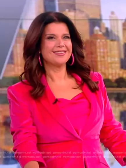 Ana Navarro on The View on ABC was spotted wearing this pink velvet blazer on The View on Nov 10 2023's episode. Ana's Blazer is the Chenille Velvet Scrunched Blazer by Cinq a Sept.