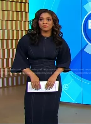 Morgan Norwood on Good Morning America on ABC was spotted wearing this navy dress with white stitching on Good Morning America on Nov 10 2023's episode. Morgan's Dress is the Belted Contrast Stitch Puff Sleeve Midi Dress in navy in navy by Asos.