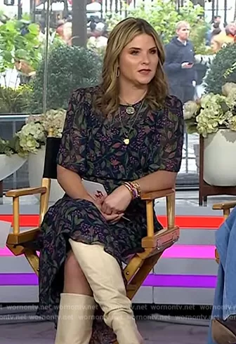 Jenna Bush Hager on Today on NBC was spotted wearing this blue floral print sheer dress on Today on Nov 10 2023's episode. Jenna's Dress is the Vida Ruffled Silk Georgette Midi-Dress by Saloni.