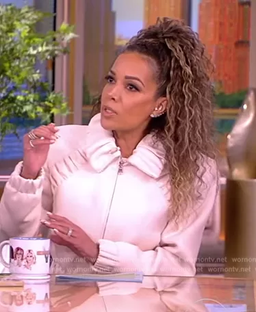 Sunny Hostin on The View on ABC was spotted wearing this white ruffle collar jacket on The View on Nov 09 2023's episode. Sunny's Jacket is the Ruched High-Neck Jacket by AnOnlyChild . Sunny's Pants is the Wool-blend wide-leg suit trousers by Zimmermann.