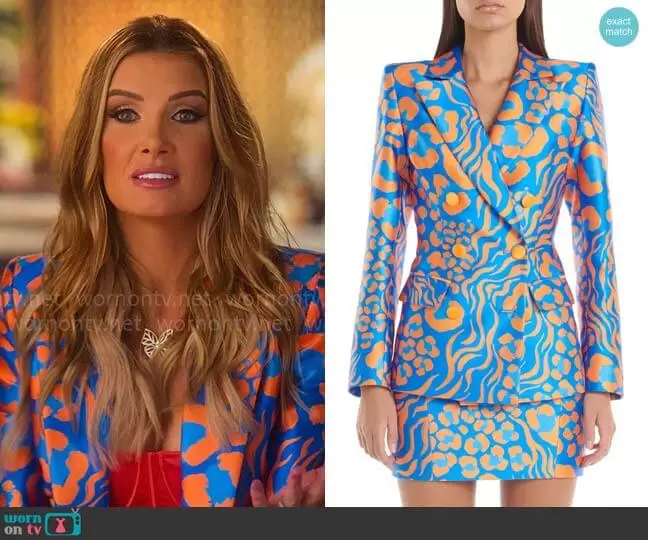 Nicole Young on Selling Sunset on Netflix was spotted wearing this orange and blue printed blazer and butterfly necklace on Selling Sunset on episode 'Cabo San Loco' (7x07) in Nov 2023. Nicole's Jacket is the Eden Blazer by Eliya the Label . Nicole's Necklace is the Flutter Cubic Zirconia Butterfly Pendant Necklace by Nadri.