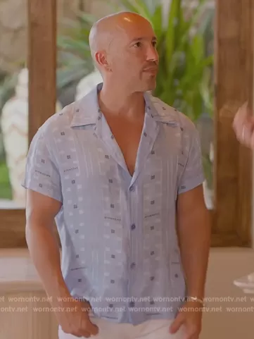 on Selling Sunset on Netflix was spotted wearing this blue printed shirt on Selling Sunset on episode 'Oppenheim Wine' (7x08) in Nov 2023. 's Shirt is the Hawaiian Shirt In 4G Jacquard by Givenchy.