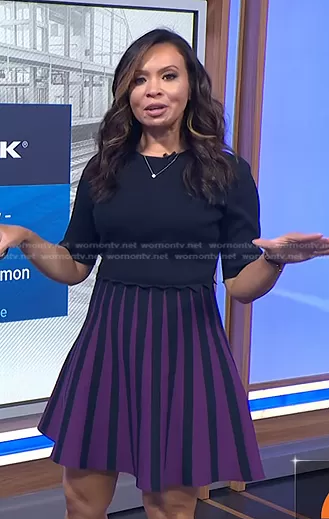 Adelle Caballero on Today on NBC was spotted wearing this navy and purple striped knit dress on Today on Nov 13 2023's episode. Adelle's Dress is the Knitted Skater Dress by Ted Baker.