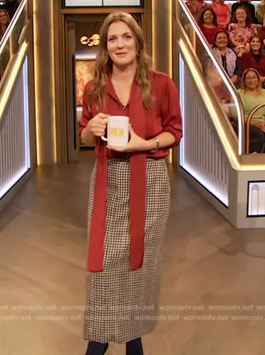 Drew Barrymore on The Drew Barrymore Show on CBS was spotted wearing this red tie neck blouse and skirt on The Drew Barrymore Show on Nov 13 2023's episode. Drew's Top is the Red Tie Neck Blouse by Lafayette 148 . Drew's Skirt is the Harris Check Wool Pencil Skirt by Carolina Herrera.