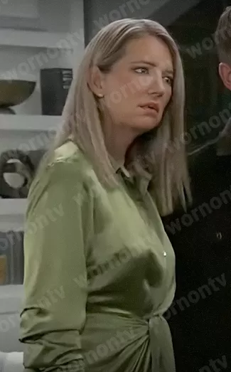 Nina showcased her impeccable style on GH with the Jacey Dress in Moss by Cinq a Sept. The dress, in a captivating mid-green hue, is made from luxurious silk, giving it a lustrous and elegant appearance. Its standout feature is the flattering tie waist, which artfully drapes from the waistline, enhancing the dress's silhouette and adding a touch of sophistication. This ensemble highlights Nina's ability to blend elegance and fashion-forward thinking, making her character stand out with a blend of timeless grace and modern chic. The green satin shirtdress serves as a perfect representation of her character's dynamic and stylish persona.