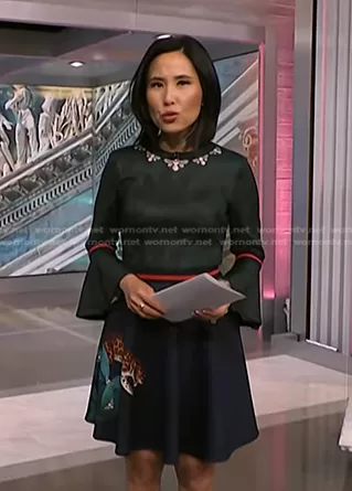 Vicky Nguyen on NBC News Daily on NBC was spotted wearing this green leopard print dress on NBC News Daily on Nov 13 2023's episode. Vicky's Dress is the Emileen Floral Minidress by Ted Baker.