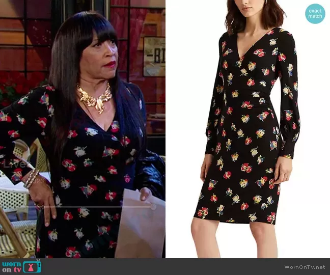 Paulina Price (played by Jackée Harry) on Days of our Lives on Peacock was spotted wearing this black floral wrap dress and necklace on Days of our Lives on Nov 14 2023's episode. Paulina's Dress is the Floral Surplice Jersey Dress by Lauren Ralph Lauren . Paulina's Necklace is the Sparkly Flower Necklace by Zara.