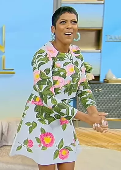 Tamron Hall on Tamron Hall Show on ABC was spotted wearing this blue floral print dress and cardigan on Tamron Hall Show on Nov 14 2023's episode. Tamron's Dress is the Camellia Jacquard Fit and Flare Knit Sleeveless Dress by Oscar de la Renta . Tamron's Sweater is the Camellia Jacquard Cardigan by Oscar de la Renta.