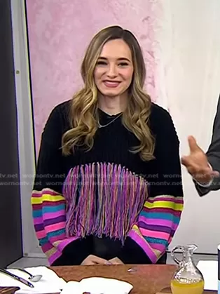 on Today on NBC was spotted wearing this fringed stripe sweater on Today on Nov 14 2023's episode. 's Sweater is the Ollie Fringe Sweater by The House of Perna.