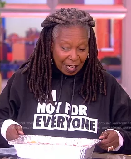 Whoopi Goldberg on The View on ABC was spotted wearing this I’m not for everyone print hoodie on The View on Nov 15 2023's episode. Whoopi's Sweater is the I'm Not For Everyone Hoodie by Power in Black.